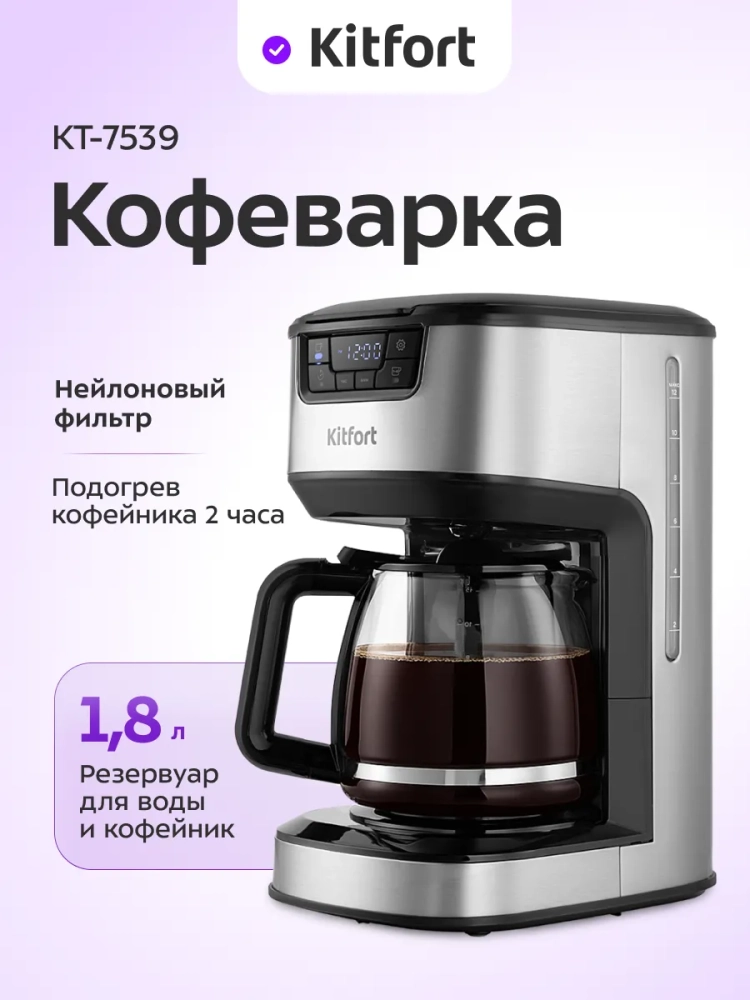 Капельная кофеварка Kitfort КТ-7539 готовит ароматный черный кофе из молотого кофе.