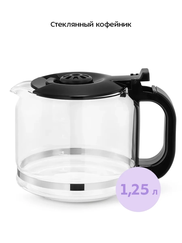 Резервуар для воды емкостью 1,25 л позволяет за один раз приготовить кофе на 10 чашек (по 120 мл). На резервуаре для воды и кофейнике нанесены соответствующие отметки, поэтому вам будет удобно приготовить нужное количество чашек кофе. Кофейник стеклянный, поэтому вы всегда можете видеть, сколько кофе осталось.