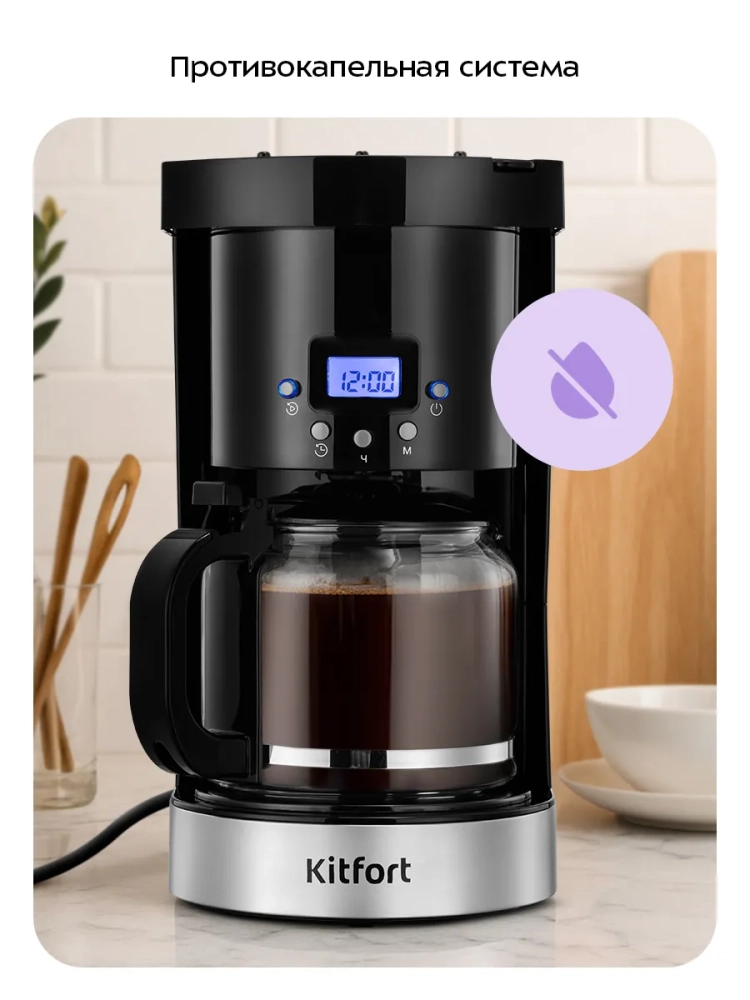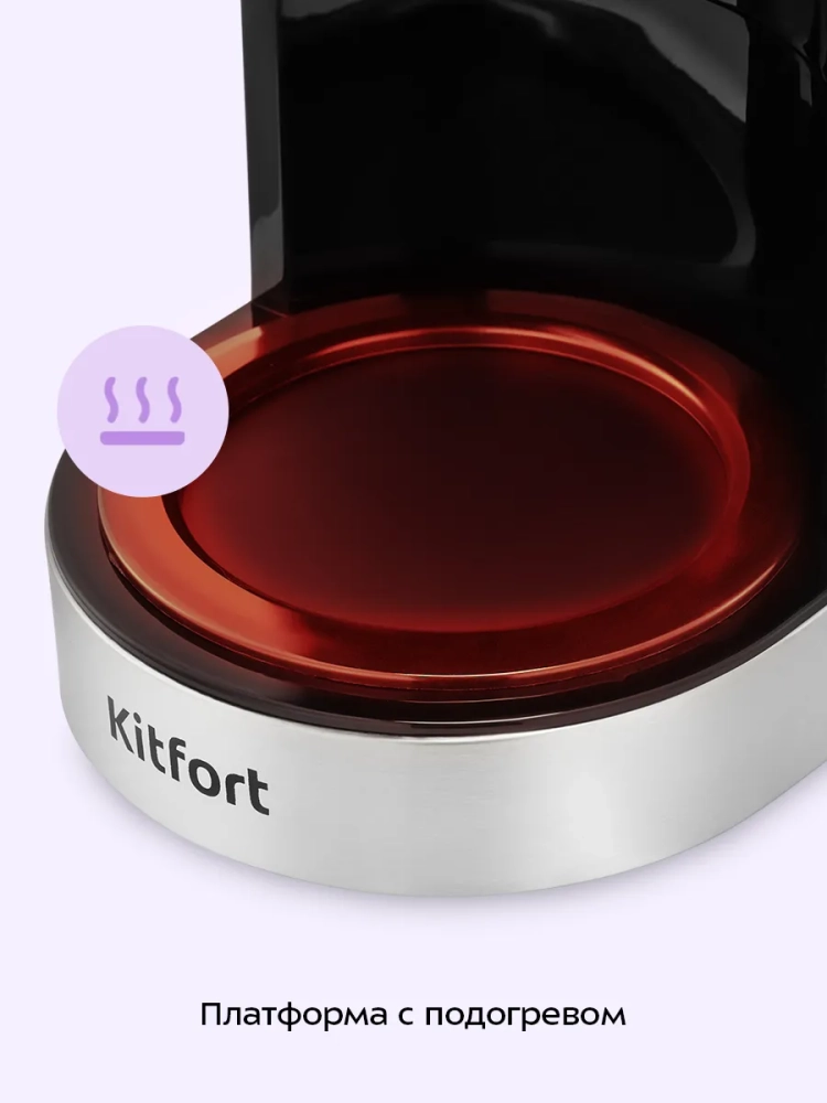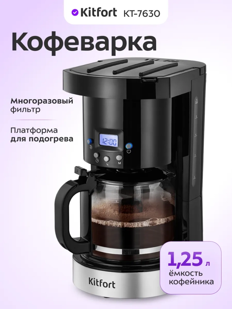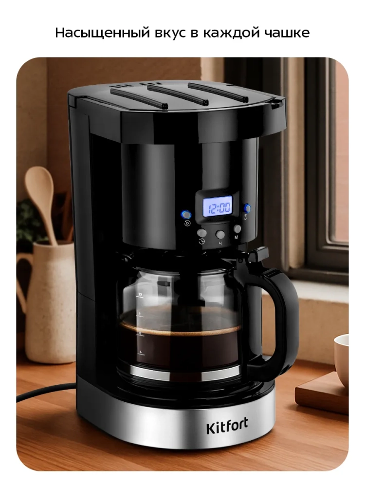 Капельная кофеварка Kitfort КТ-7630 готовит ароматный черный кофе из молотого кофе.