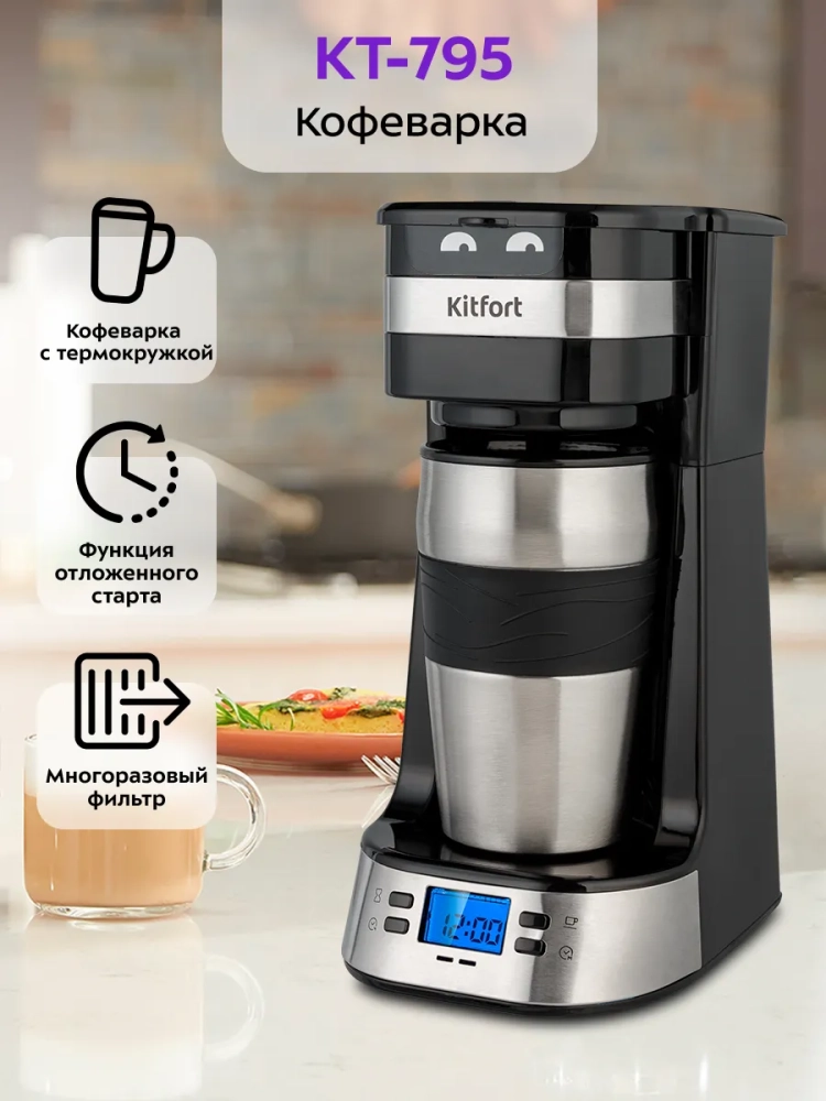 Кофеварка KT-795 оборудована дисплеем, который показывает текущее время и заданные настройки. Данная кофеварка поддерживает функцию отложенного старта, которая позволяет задать нужное время приготовления кофе. Вам больше не придется вставать утром пораньше, чтобы успеть приготовить себе свежий кофе. Также кофеварка оснащена прорезиненными ножками, которые предотвращают скольжение по столу. Кофеварка предназначена для приготовления кофе в домашних условиях или в офисе.