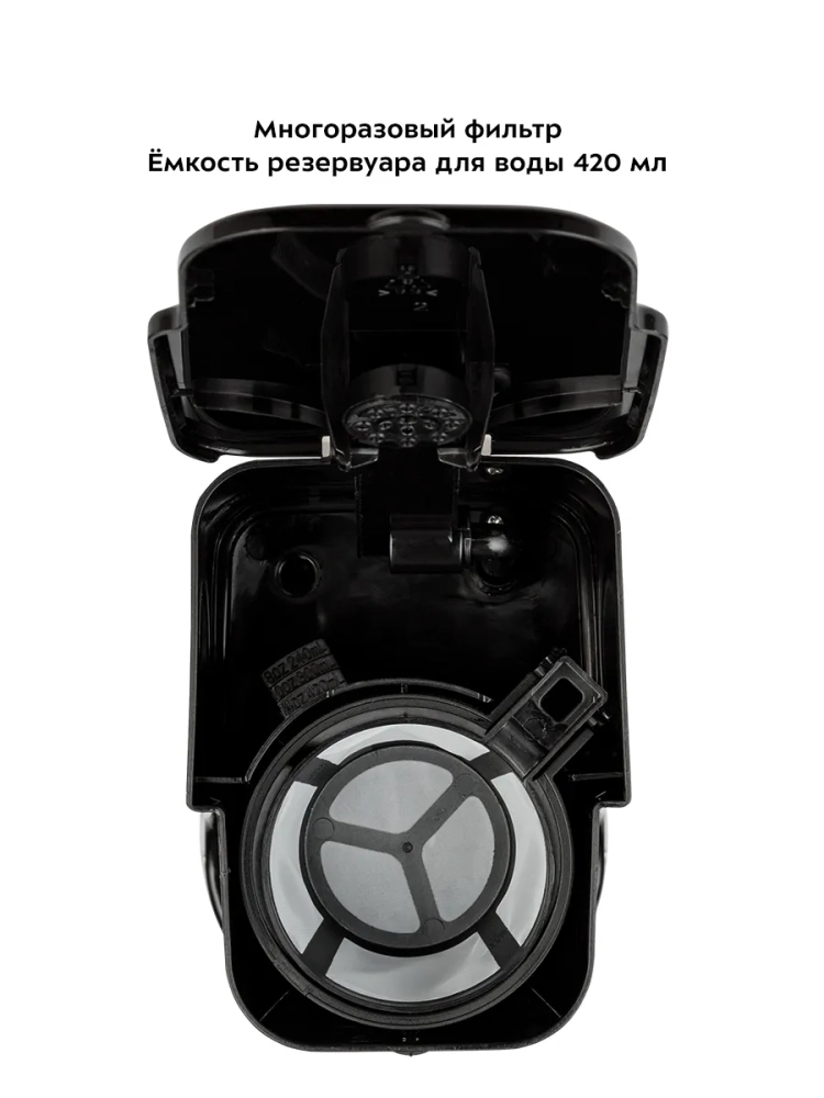 Компактная кофеварка KT-795 экономит место на кухне и рассчитана на приготовление кофе за 1 раз на 1–3 чашки. Многоразовый фильтр вмещает 15 грамм молотого кофе. А в резервуаре для воды есть специальные отметки 240, 300 и 420 мл, которые помогают налить необходимый объем воды для приготовления кофе.