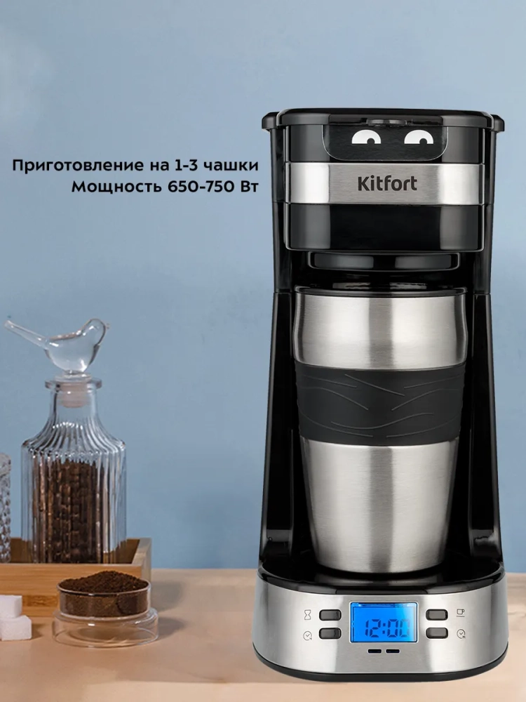 Капельная кофеварка Kitfort КТ-795 готовит ароматный черный кофе из молотого кофе одним нажатием кнопки.