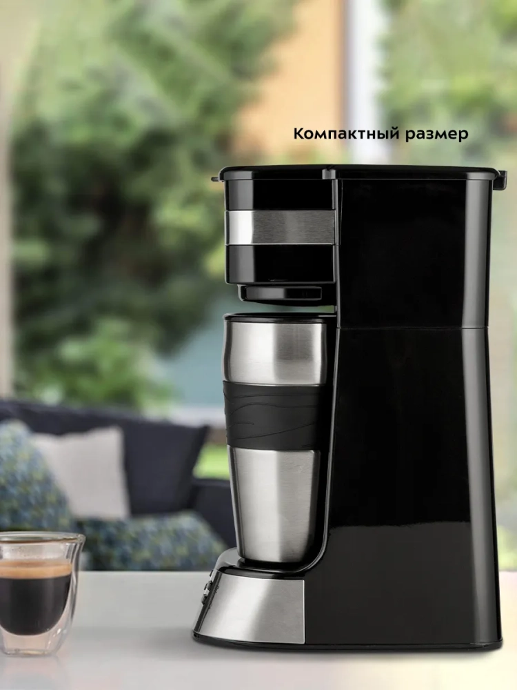 В кофеварке вода доводится до температуры 80–90 оС, после чего медленно поступает в фильтр с молотым кофе. Многоразовый фильтр позволяет заваривать кофе неограниченное количество раз. Пройдя через него, она попадает в термокружку, которая сохранит тепло вашего кофе. Термокружка выполнена из пластика и нержавеющей стали с силиконовой вставкой, которая не дает вам обжечься или выронить из рук термокружку. А крышка термокружки позволяет пить кофе на ходу, благодаря удобной форме отверстия для питья, которое можно закрывать, например, при ходьбе.