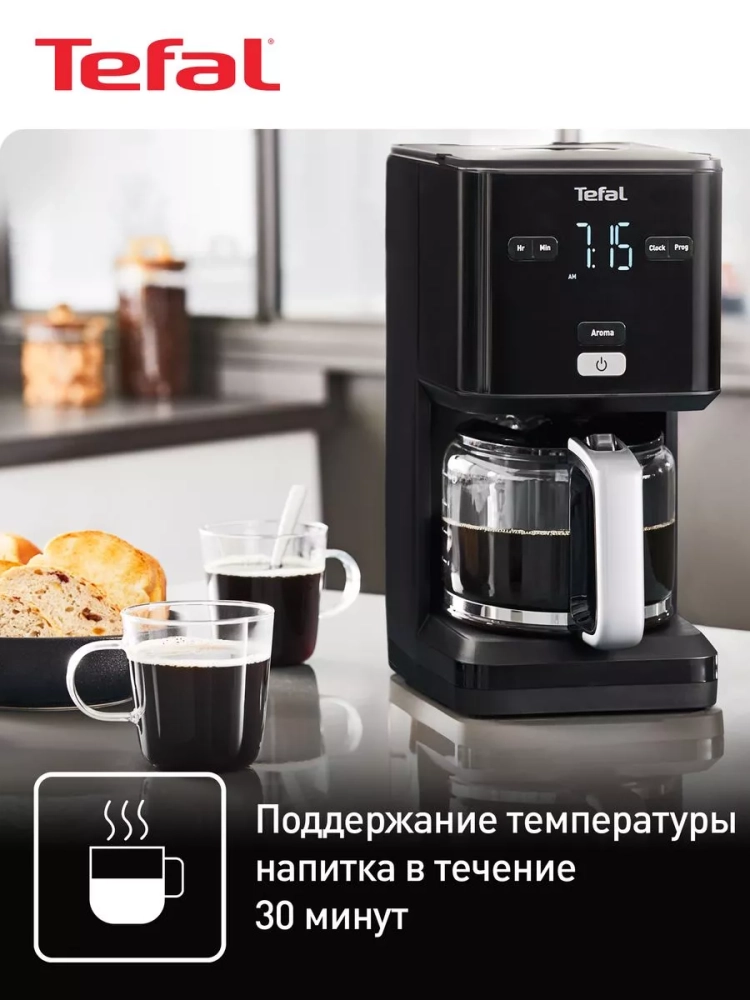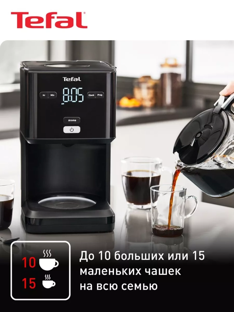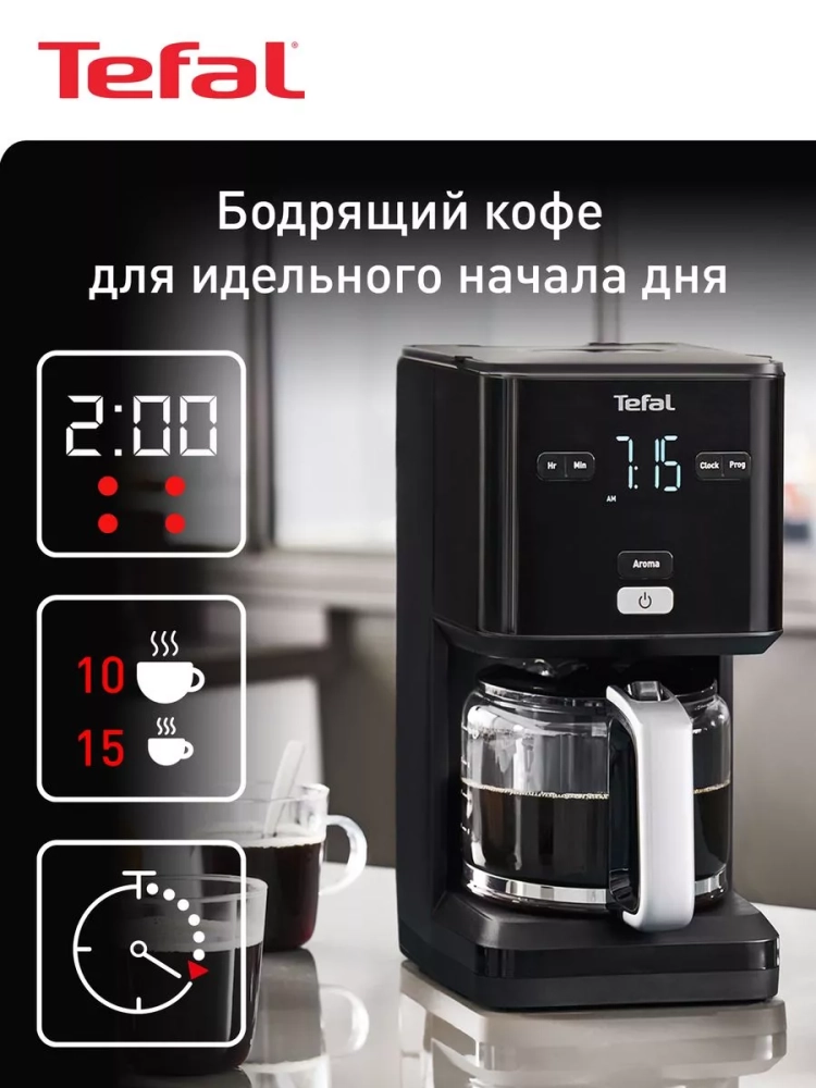 Вкусный и ароматный кофе начинается с удобной и красивой кофеварки Tefal Smart&Light CM600810. Капельная кофеварка оснащена яркой и интуитивной сенсорной панелью с простым управлением, которая позволяет запустить цикл варки в любое удобное время или запрограммировать автоматическое приготовление кофе благодаря таймеру отложенного старта до 24 ч.