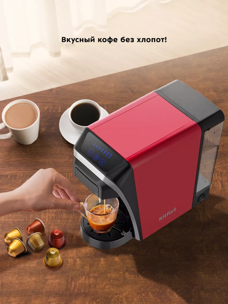 Кофеварка Kitfort КТ-7227 (3 в 1) — многофункциональное устройство, сочетающее в себе функции капсульной и рожковой кофеварки. Благодаря адаптерам кофеварка подходит для капсул типа Nespresso Original и Dolce Gusto, а также для молотого кофе.