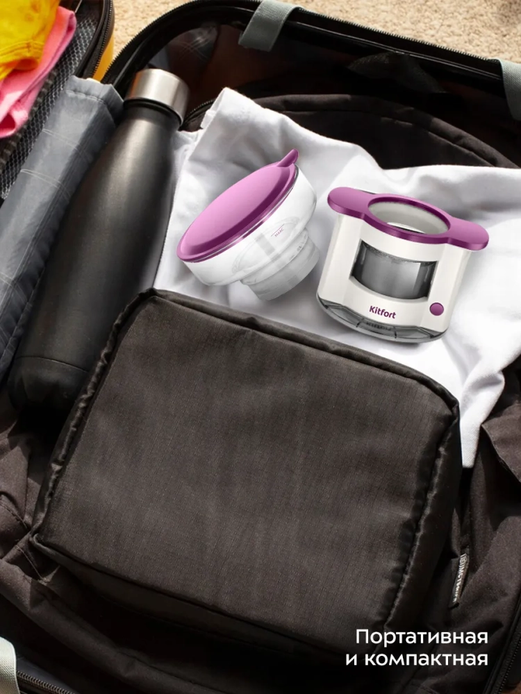 Портативная кофеварка Kitfort КТ-7576 готовит ароматный черный кофе из молотого кофе.