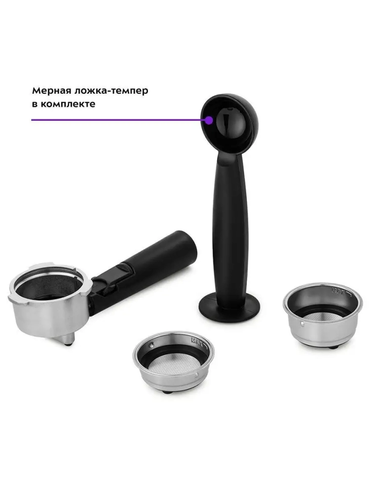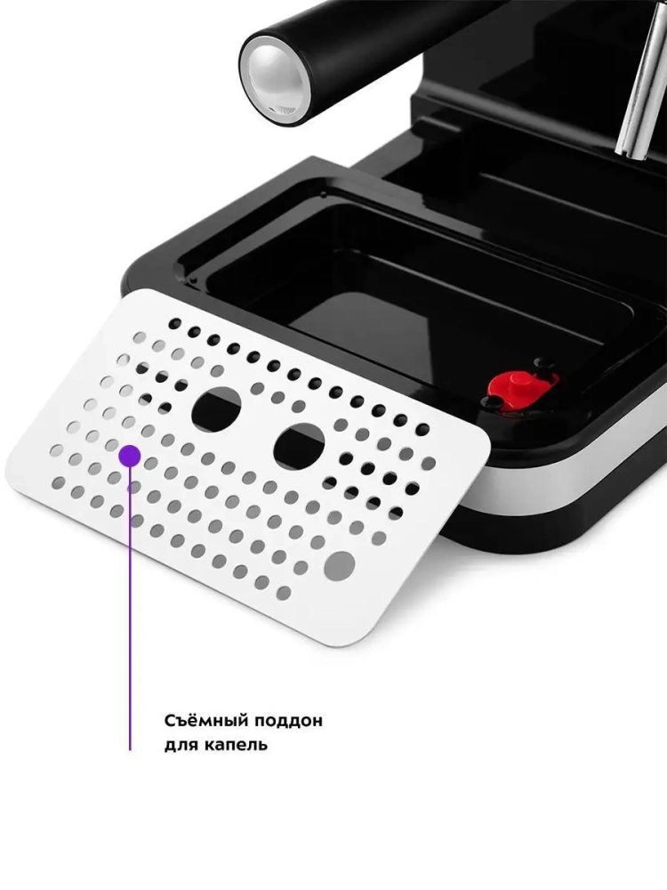 Металлический фильтр с лазерным нанесением отверстий долговечен и не требует использования каких-либо расходующихся частей. Кофеварка оснащена съемным резервуаром для воды.