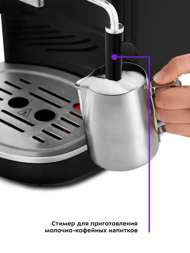 Молочную пенку для капучино нужно делать самостоятельно. Капучинатор в кофеварке - это паровая трубка с насадкой панарелло. Трубку погружают в холодное молоко, включают подачу пара и взбивают молочную пенку.