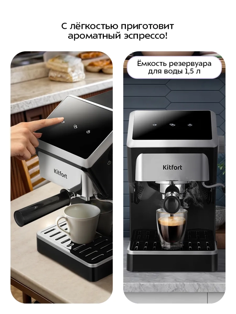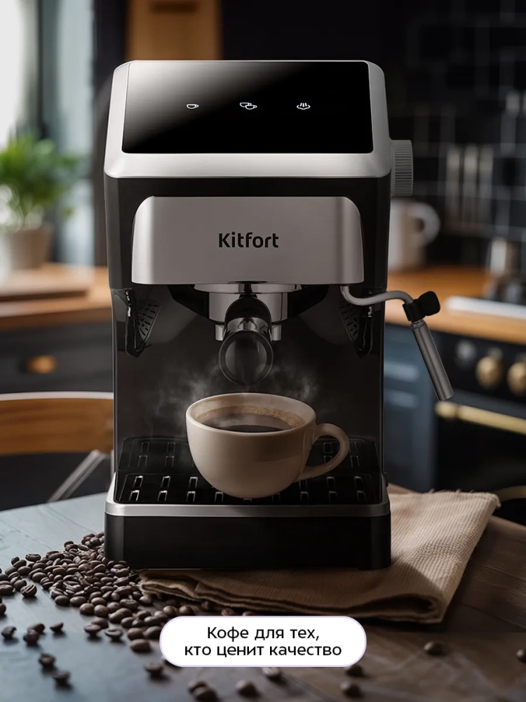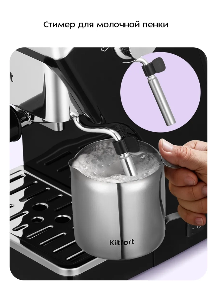 Рожковая кофеварка Kitfort КТ-7647 поможет приготовить эспрессо, капучино или латте, а также множество других видов кофе на ваш вкус. С помощью стимера на кофеварке вы можете подогреть паром остывший чай, молоко или другие напитки.
