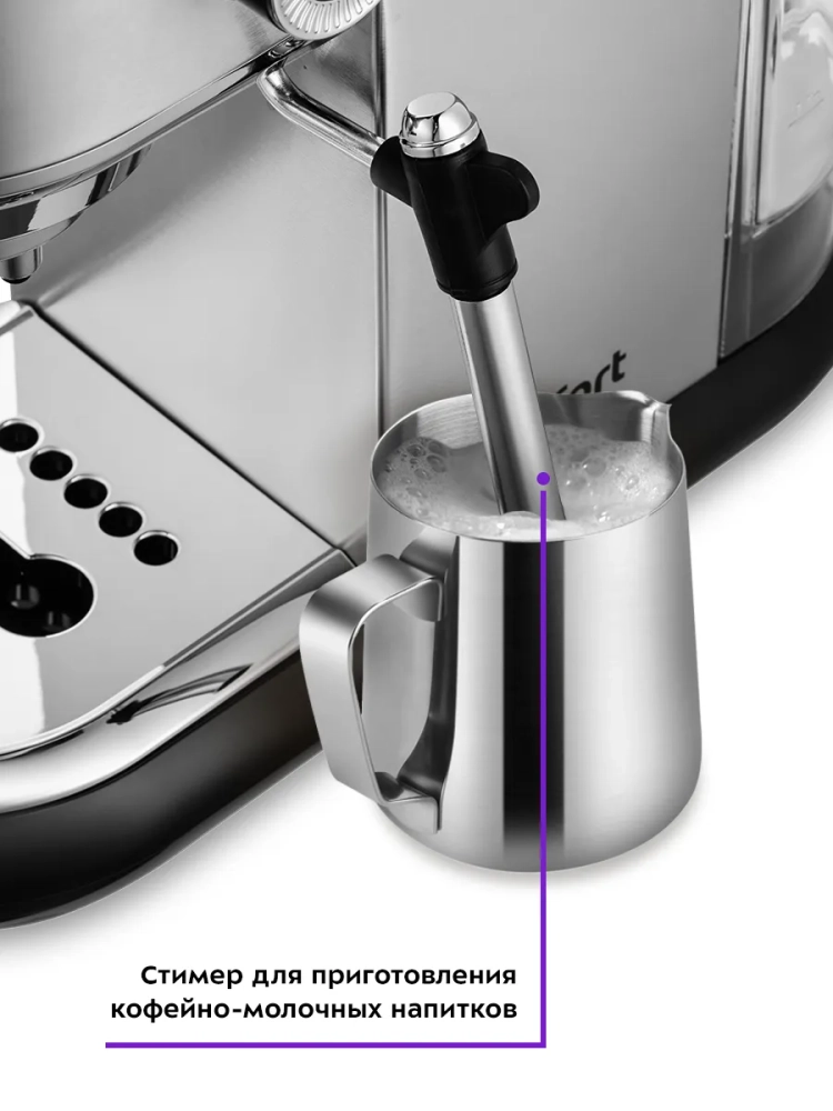 Ключевым отличием рожковой кофеварки от всех остальных кофеварок, турок и прочих кофейных устройств является наличие рожка, его часто называют холдер. Молотый кофе помещается в фильтр рожка и прессуется в таблетку. Процесс трамбовки также называют темперовкой. Правильная темперовка - довольно-таки ювелирный процесс. Если утрамбовать слишком сильно, то воде потребуется гораздо больше времени для прохождения сквозь плотный слой кофе, вкус напитка будет очень горьким. Если утрамбовать слабо, то вода пройдет сквозь неплотный слой слишком быстро и вкус кофе будет кислым и водянистым. Молочную пенку для капучино и латте можно делать самостоятельно. Капучинатор в кофеварке — это паровая трубка с насадкой панарелло. Трубку погружают в холодное молоко, включают подачу пара и взбивают молочную пенку. Процесс приготовления молочной пенки потребует от вас некоторой сноровки. Но если вы все сделаете правильно, у вас получится однородная и гладкая сладковато-сливочная на вкус пенка. Металлические фильтры с лазерным нанесением отверстий долговечны и не требуют использования каких-либо расходующихся частей. Кофеварка оснащена съемным резервуаром для воды и металлическим рожком. Металлический рожок хорошо прогревает напиток, а сам напиток получается насыщенным, густым и с хорошей пенкой. Ценители кофе выбирают рожковые кофеварки для дома, потому что им важно непосредственно участвовать в процессе приготовления кофе, создавать свои собственные рецепты, узнавать тонкости и хитрости настоящего кофейного напитка. Рожковая кофеварка - отличный выбор для гурманов, желающих ежедневно наслаждаться полным букетом вкуса свежего кофе. Особая технология приготовления позволяет сохранить большое количество полезных веществ и тонкий аромат напитка.