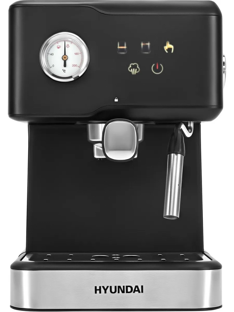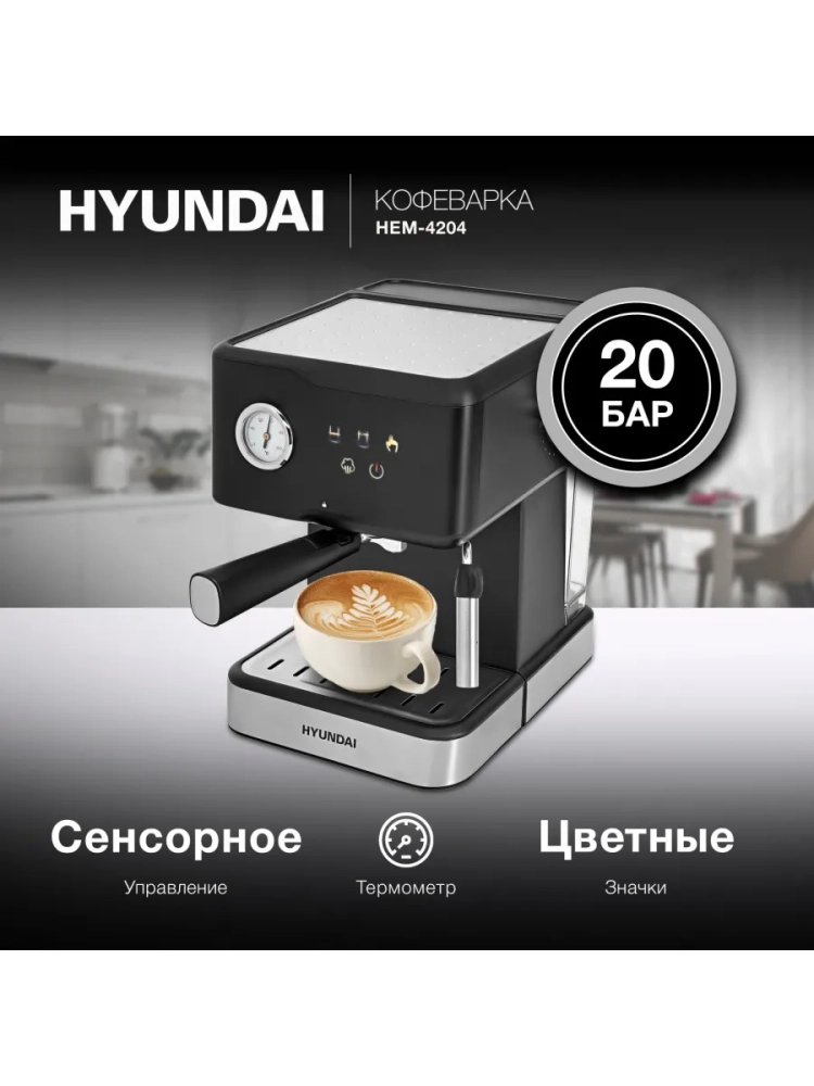 Кофеварка рожковая Hyundai HEM-4204 черный, мощность 1000Вт, используется молотый кофе, давление помпы 20Бар.Классический форм фактор с цветными иконками на сенсорном дисплее, а так же термомтером для контроля температуры заваривания. Программы на 1 и 2чашки, ручная программа для самостоятельного дозирования.