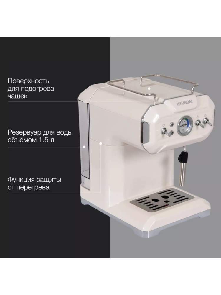 Кофеварка рожковая Hyundai HEM-5300 бежевый/серебристый, мощность 850Вт, используется молотый кофе, давление помпы 20Бар