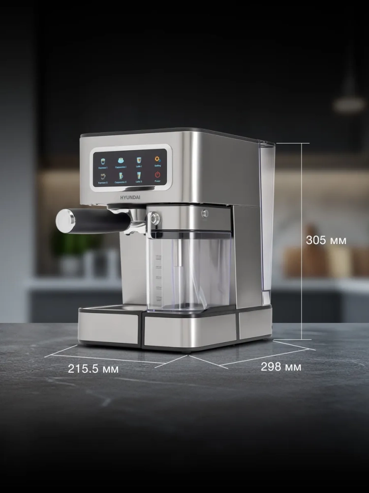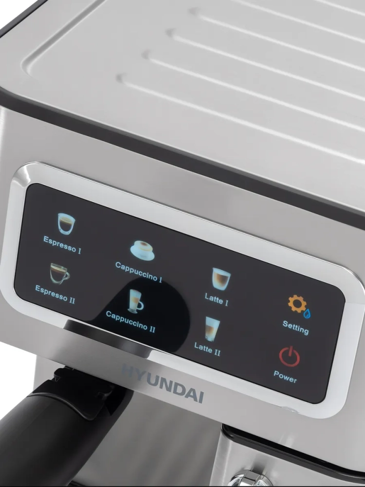Кофеварка рожковая Hyundai HEM-5306 серебристый/черный, мощность 1350Вт, используется молотый, давление помпы 20Бар.Кофеварка рожкового типа с возможностью автоматического приготовления молочных напитков.
