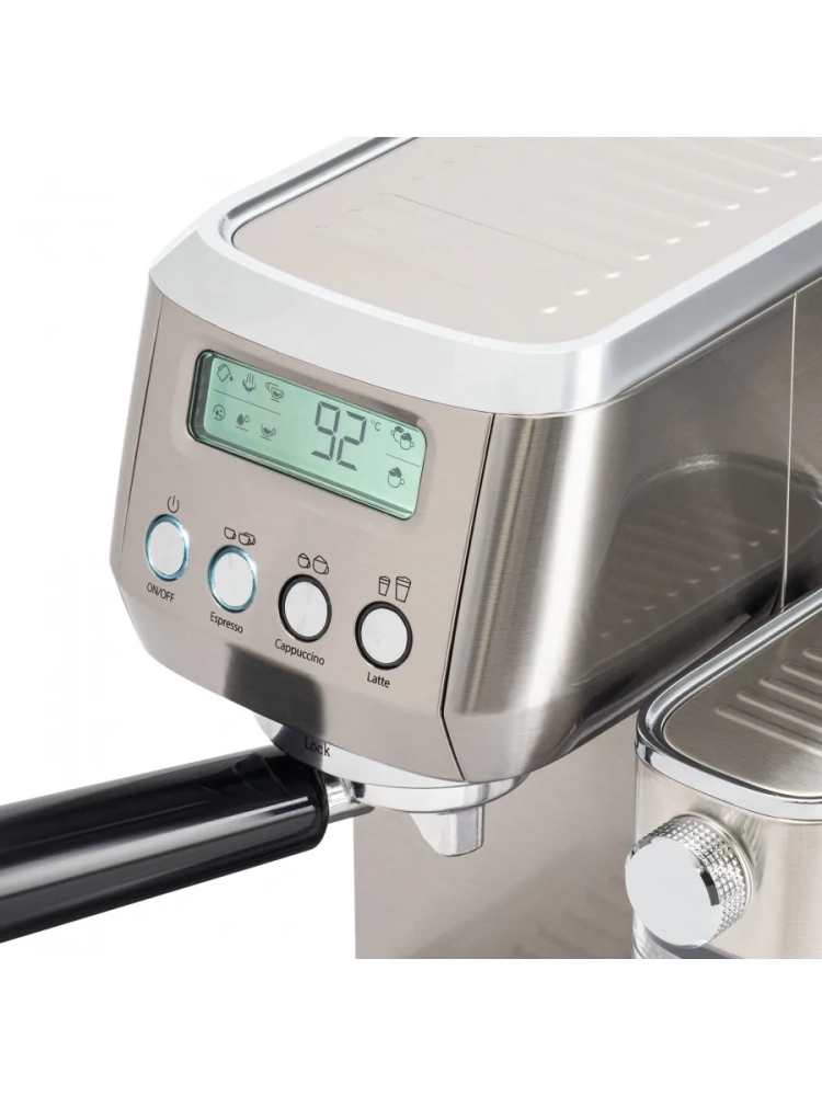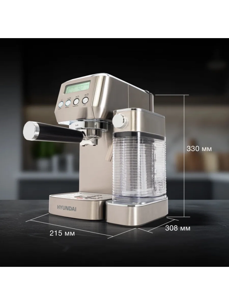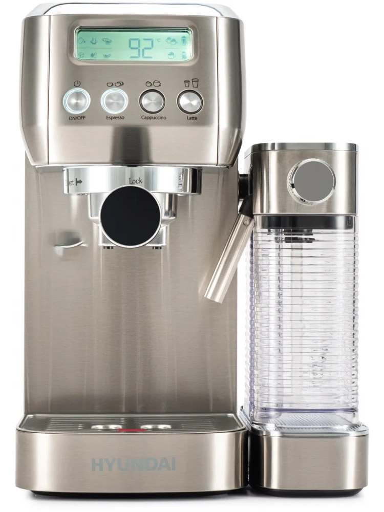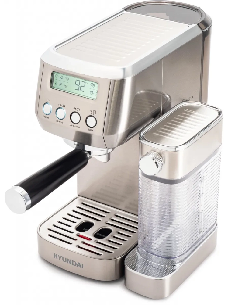 Кофеварка рожковая Hyundai HEM-9999 серебристый, мощность 1350Вт, используется молотый кофе, давление помпы 20Бар.7 программы работы, программирование размера порций, легкосъемный контейнер для молока 0,7л, съемный поддон для капель и резервуар для воды 1,3л, подогрев чашек.Итальянская помпа 20бар с функцией предварительного заваривания для качественного экстрактирования кофе. Профессиональный металлический темпер для правильной прессовки, фильтры на 7 и 14грамм кофе в комплекте.