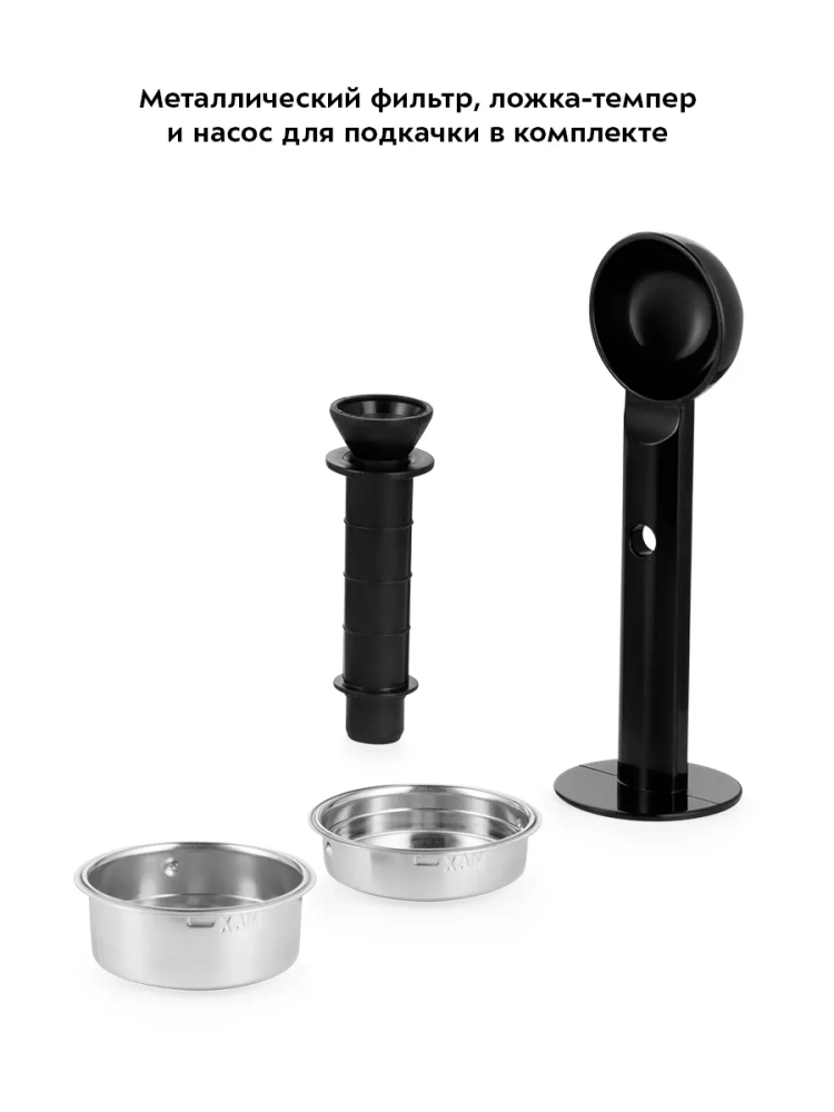 Кофеварка оснащена съемным резервуаром для воды и тремя адаптерами. Мерная ложка-темпер поможет наполнить рожок и утрамбовать в нем кофейную таблетку.