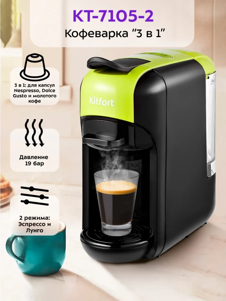 Кофеварка «3 в 1» Kitfort КТ-7105 — многофункциональное устройство, сочетающее в себе функции капсульной и рожковой кофеварки. Благодаря адаптерам кофеварка подходит для капсул типа Nespresso и Dolce Gusto, а также для молотого кофе. Капсульно-рожковая кофеварка поможет приготовить кофе эспрессо, американо или лунго, а также множество других видов кофе на ваш вкус.