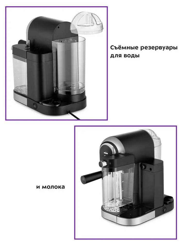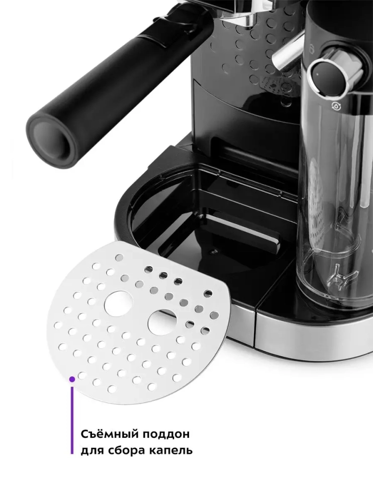 Металлические фильтры с лазерным нанесением отверстий долговечны и не требуют использования каких-либо расходующихся частей. Кофеварка оснащена съемным резервуаром для воды и металлическим рожком. Металлический рожок хорошо прогревает напиток, а сам напиток получается насыщенным, густым и с хорошей пенкой. Мерная ложка-темпер поможет наполнить рожок и утрамбовать в нем кофейную таблетку.