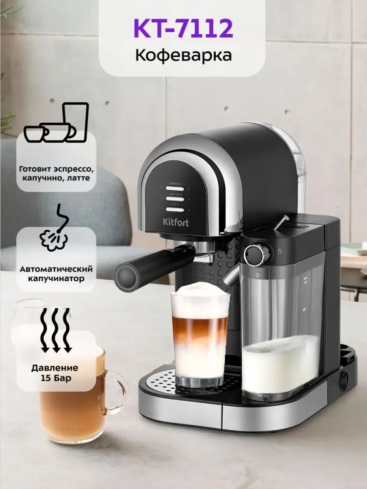 Рожковая кофеварка Китфорт КТ-7112 поможет приготовить кофе эспрессо, капучино или латте, а также множество других видов кофе на ваш вкус.