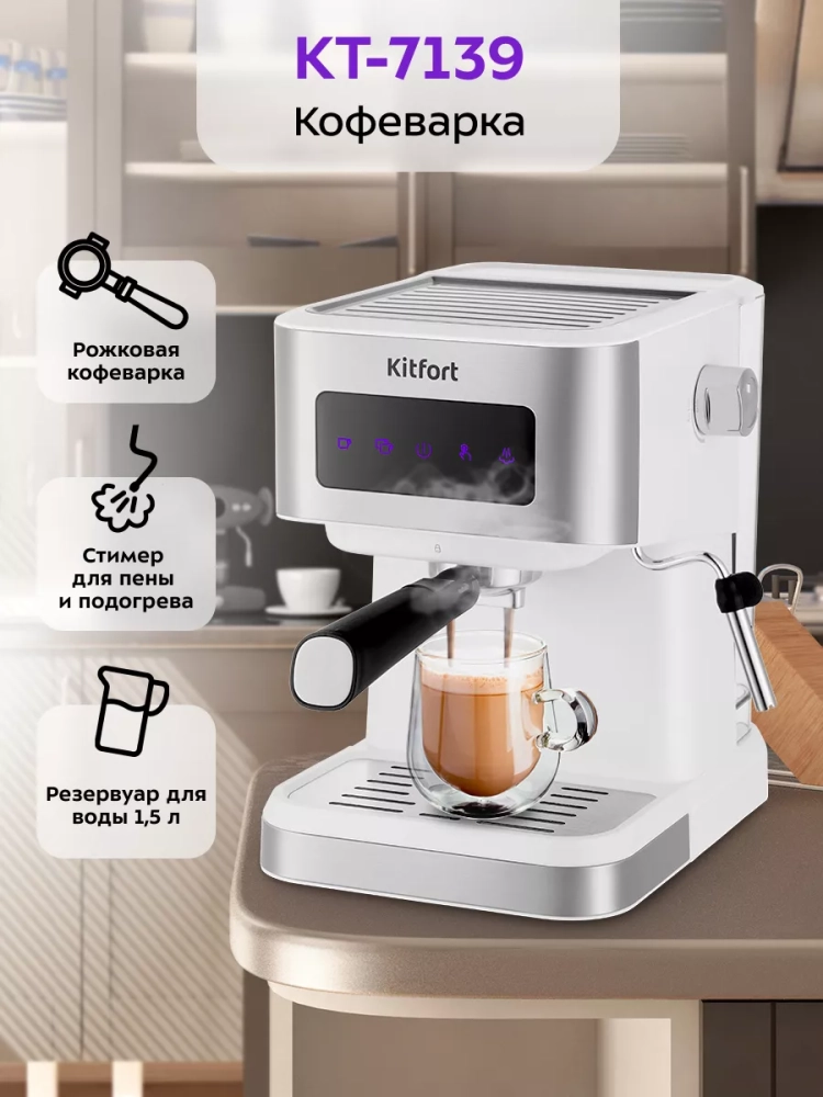 Рожковая кофеварка Kitfort КТ-7139 поможет приготовить кофе эспрессо, капучино или латте, а также множество других видов кофе на ваш вкус. С помощью стимера в рожковой кофеварке вы можете приготовить молочную пенку или подогреть паром остывший чай или молоко.