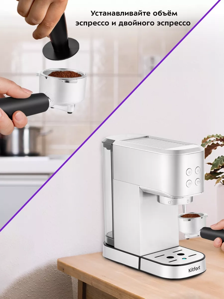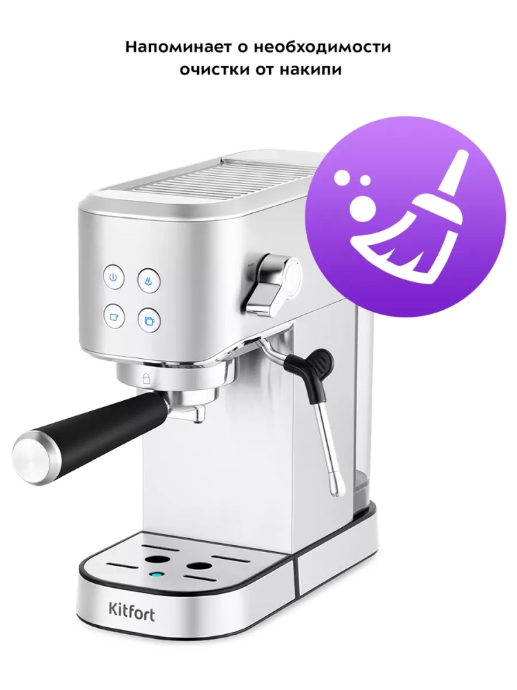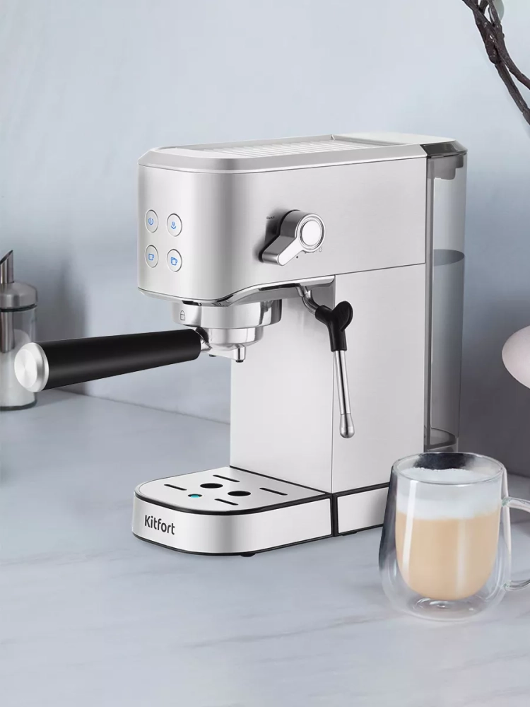 Кофеварка Kitfort КТ-7294 поможет приготовить кофе эспрессо, капучино или латте, а также множество других видов кофе на ваш вкус. С помощью стимера вы можете приготовить молочную пенку, а также подогреть паром остывший чай или молоко.