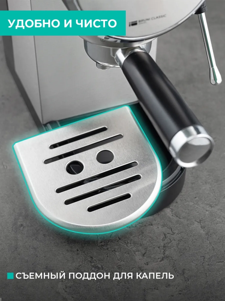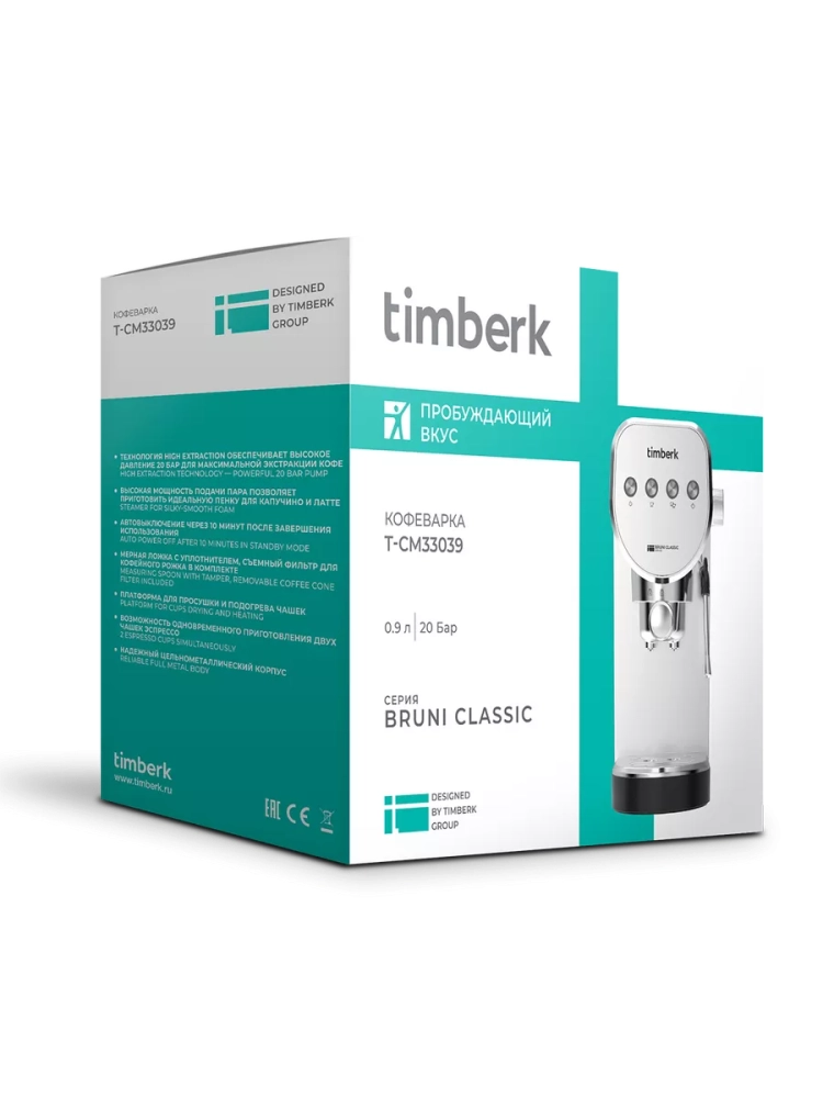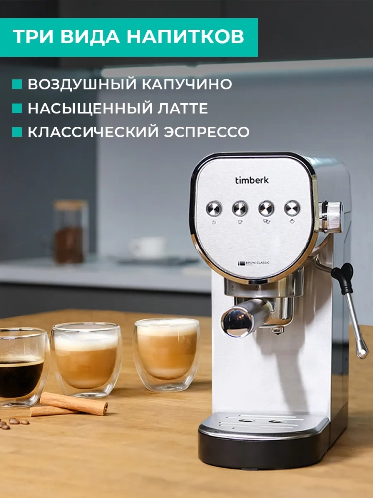 Заряд бодрости с кофеварками Timberk! Мощная помпа создает высокое давление 20 бар благодаря технологии High Extraction. Капучинатор обеспечивает высокую мощность подачи пара для получения воздушной молочной пенки. Прибор отвечает требованиям безопасности и оснащен функциями защиты от перегрева и перегрузки. Система энергосбережения выключает прибор через 10 минут после завершения использования. В комплект прибора входят ложка с уплотнителем для трамбовки кофейного порошка, съемный фильтр для кофейного рожка на две порции, съемный поддон для капель.