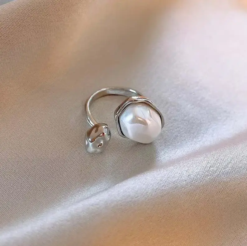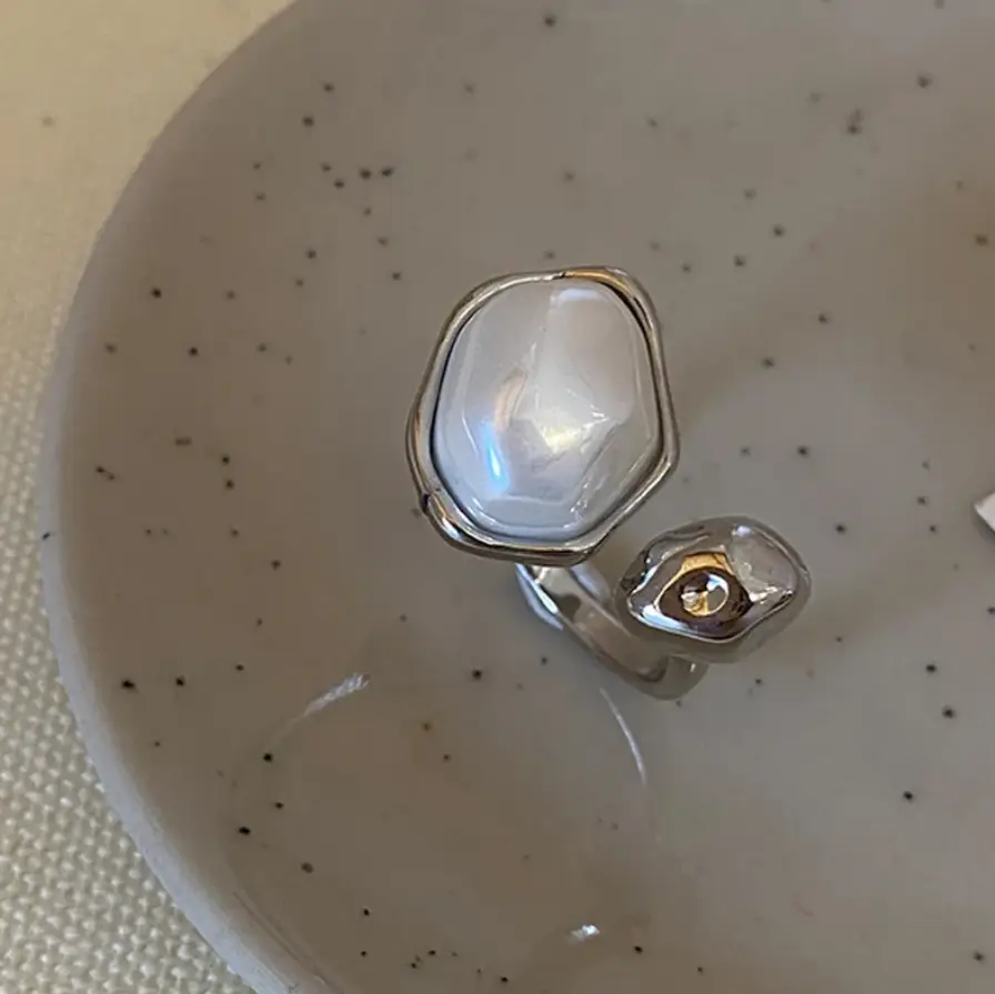 Кольцо ассиметричное с жемчужиной серебристое