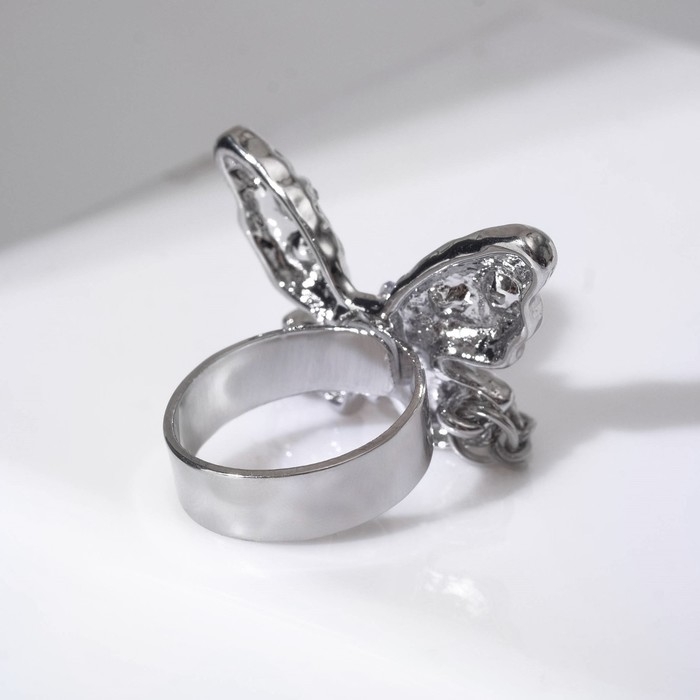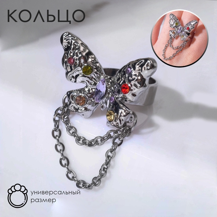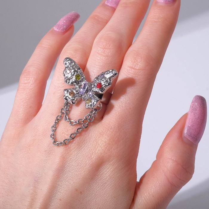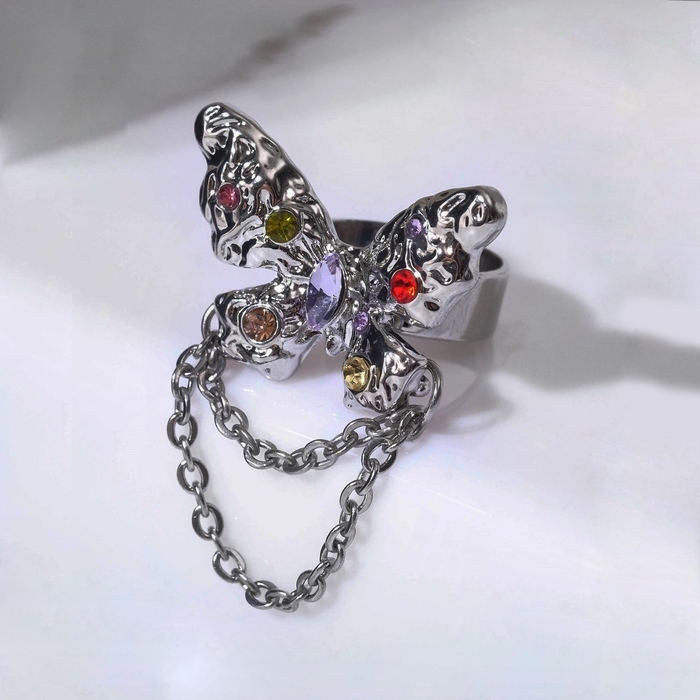 Кольцо «Бабочка» с цепочкой, цветное в серебре, безразмерное