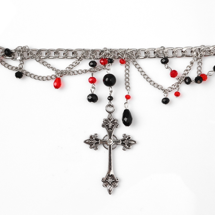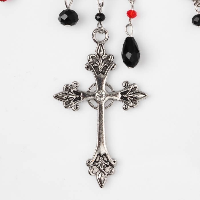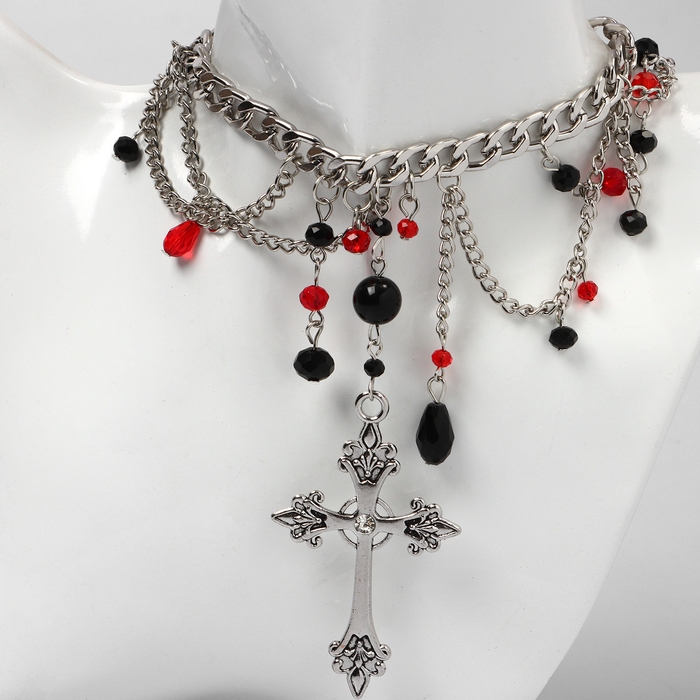 Колье «Крест» бусины с цепями, цвет чёрно-красный в серебре