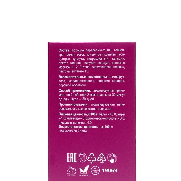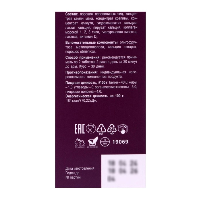 Состав: порошок перепелиных яиц, концентрат семян мака, концентрат крапивы, концентрат кунжута, гидроксиапатит кальция, лактат кальция, пируват кальция, коллаген морской 1, 2, 3 типа, гиалуроновая кислота, лактоза, витамин D3.
