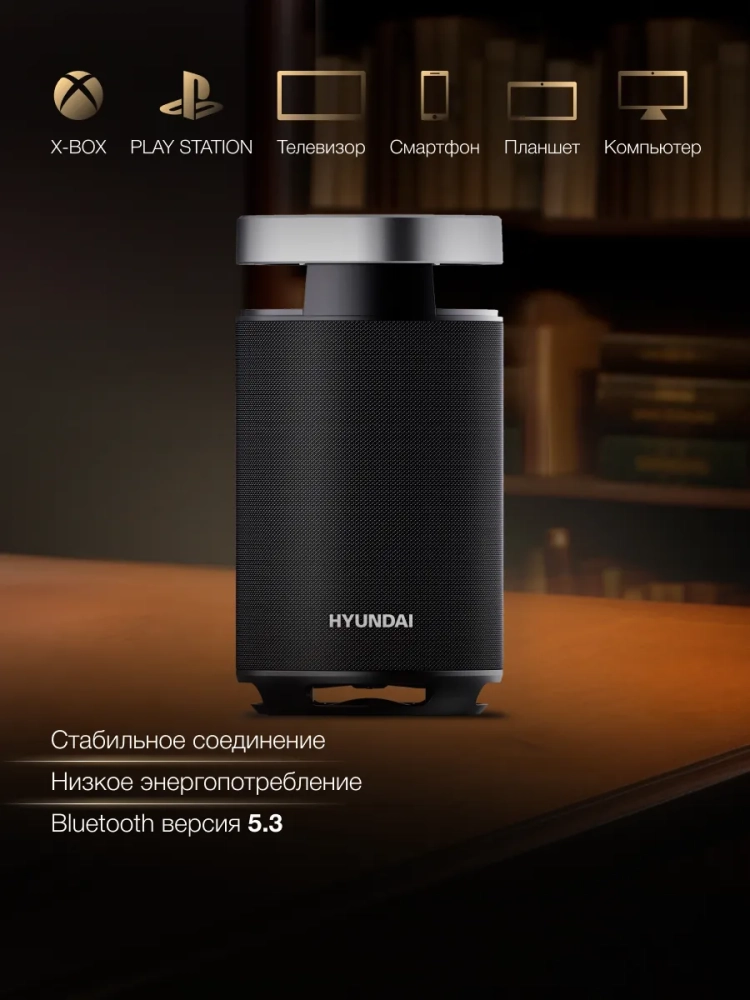Благодаря поддержке блютуз вы можете легко подключить свой смартфон или планшет. Функция TWS (True Wireless Stereo) позволяет соединить две колонки Hyundai H-MC1241 для создания мощности звука более 200 Вт. Возможно проводное соединение по AUX с медиаплеером и компьютером. Встроенный в колонку проигрыватель, воспроизводит файлы FLAC, WAV, MP3, WMA с USB флешек. Для караоке вечеринок, есть возможность подключения микрофона со штекером 6,33 мм.
