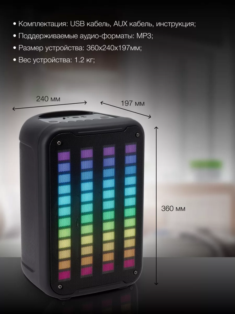 Мощности колонки в 10 Вт хватает, чтобы организовать на пикнике достаточно громкую музыку или наполнить ей небольшое помещение. Передняя панель колонка музыкальная выполнена в виде яркого эквалайзера, двигающегося в такт мелодии на манер светомузыки.