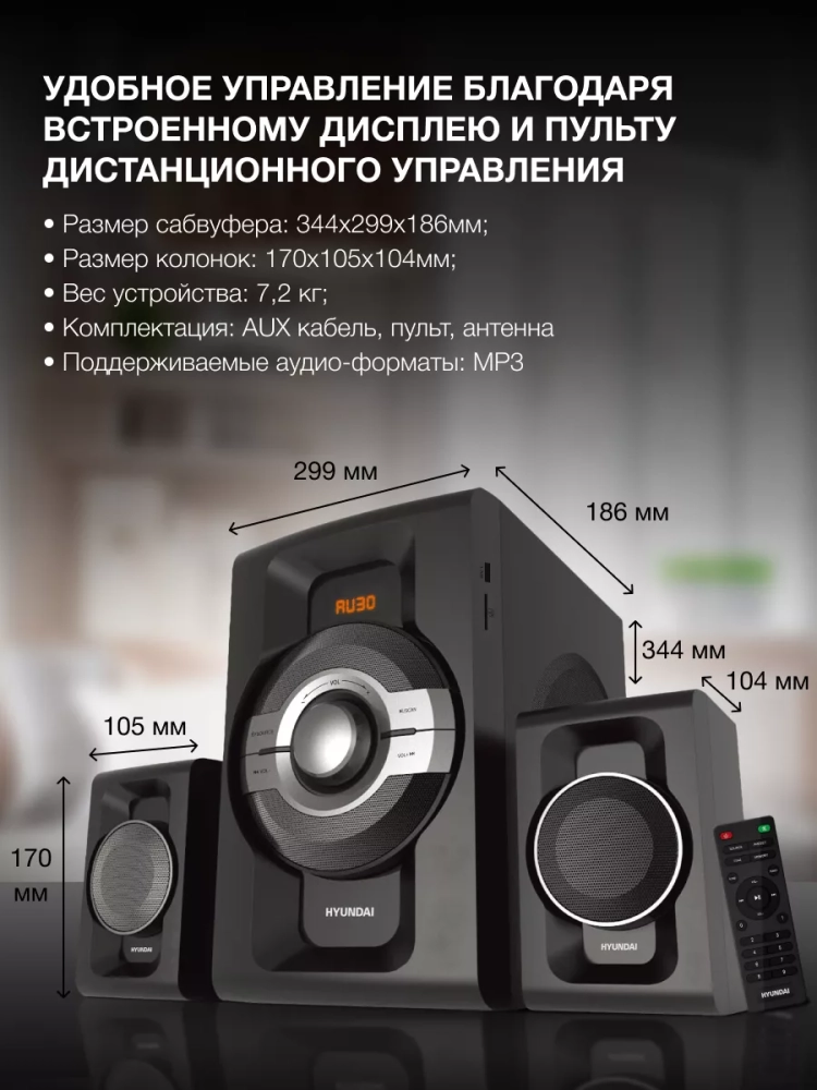 В наборе с Hyundai H-MS1403 поставляется пульт дистанционного управления. Он позволяет переключать режимы работы прибора, источники и менять множество других опций, не подходя к центру. Основные органы управления вынесены и на переднюю панель данной модели: там есть громкость, кнопка включения/выключения и смены источника сигнала, плей/сканирование, а также клавиши для переключения треков. Над ними расположен яркий светодиодный дисплей, который помогает взаимодействовать с устройством.
