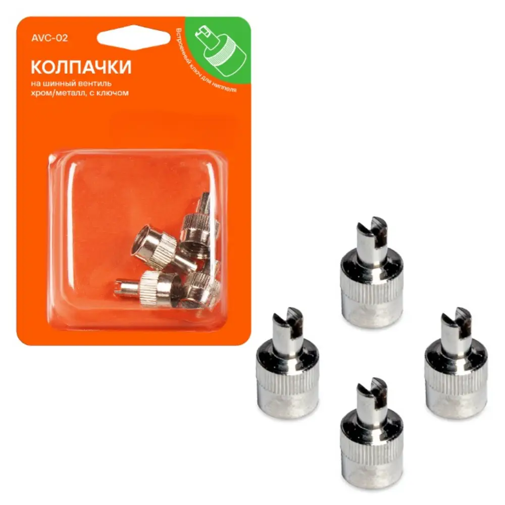 Колпачки на шинный вентиль с ключом, хром, металл, 4 шт