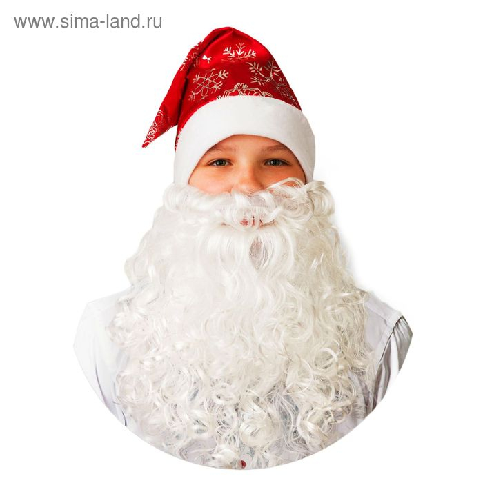 Колпак новогодний с бородой, красный со снежинками, сатин