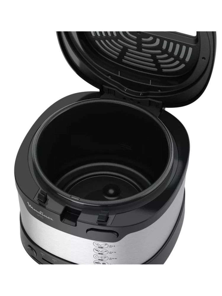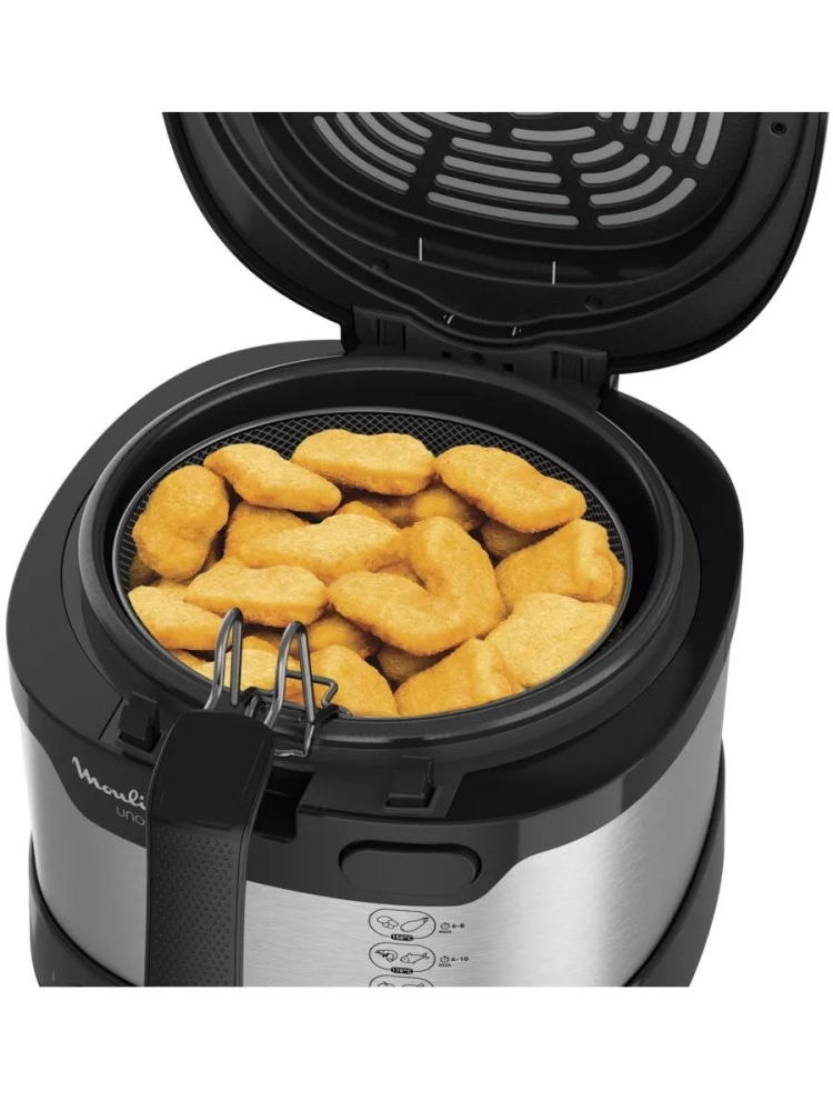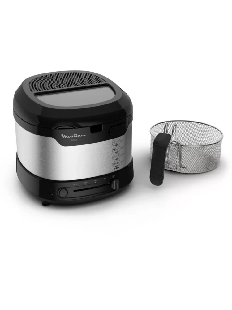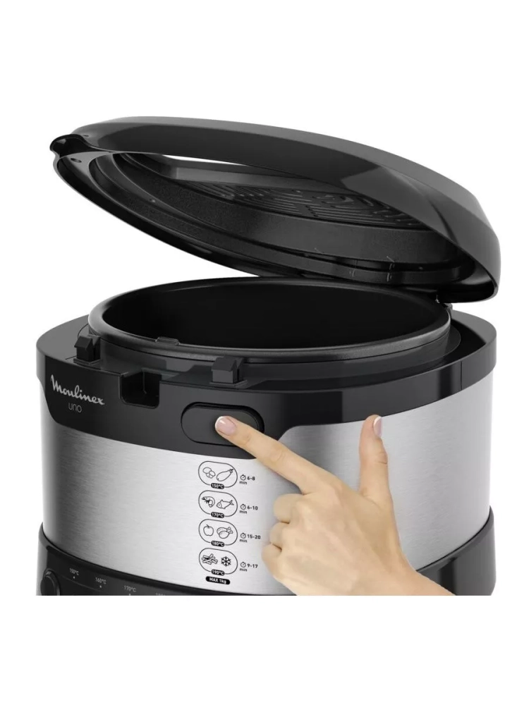 Фритюрница Fry Uno оснащена функцией автоматического открытия крышки и регулируемым термостатом (от 150 °C до 190 °C). Готовьте любимые блюда и пробуйте новые с универсальной фритюрницей Moulinex Fry Uno.