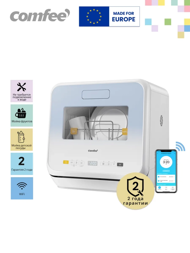 Comfee CDWC421BL-i - подключается к Wi-Fi и управляется через приложение SmartHome. В приложении Вы можете не только запустить мойку из любой точки мира, но и отслеживать уровень соли, регулировать интенсивность дозации, следить за состоянием фильтра и запускать эксклюзивные программы мытья.