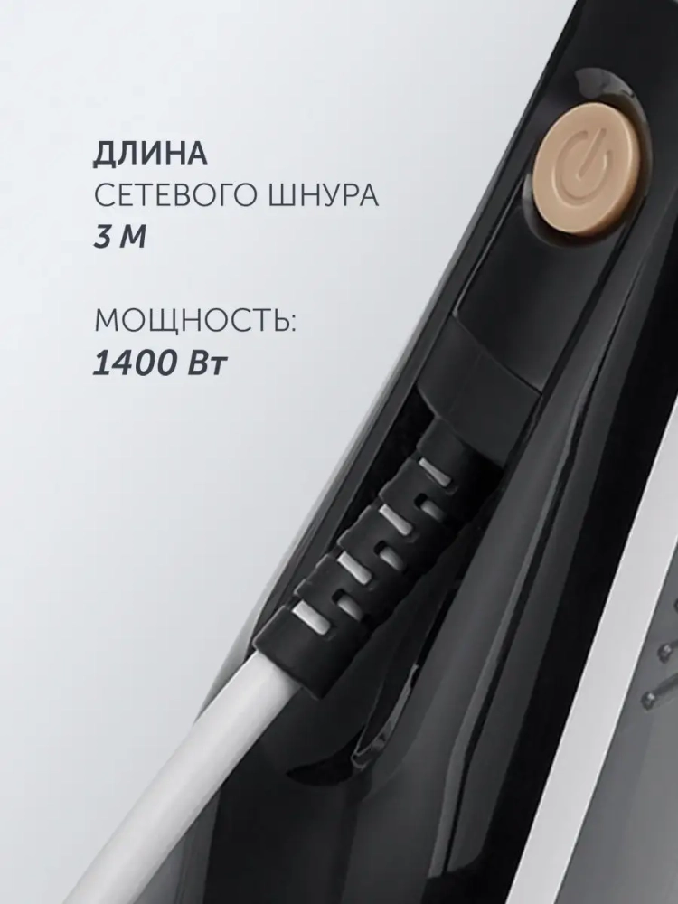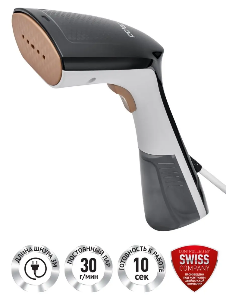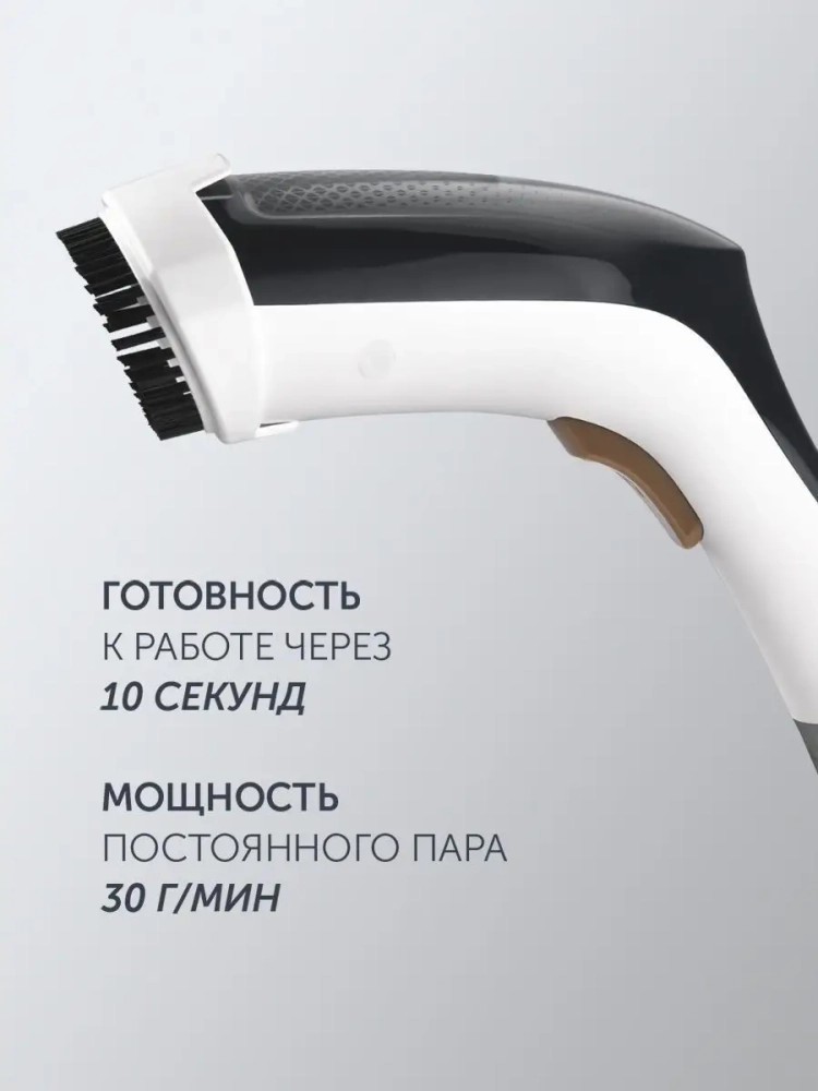 Готовность к работе через 10 секунд. Мощность постоянного пара 30 г/мин. Быстрое и легкое отпаривание без гладильной доски. Съемный резервуар для воды емкостью 100 мл.Удобная щетка-насадка для удаления ворса и загрязнений. Подходит для всех типов ткани. Длина сетевого шнура 3 м. Мощность: 1400 Вт.