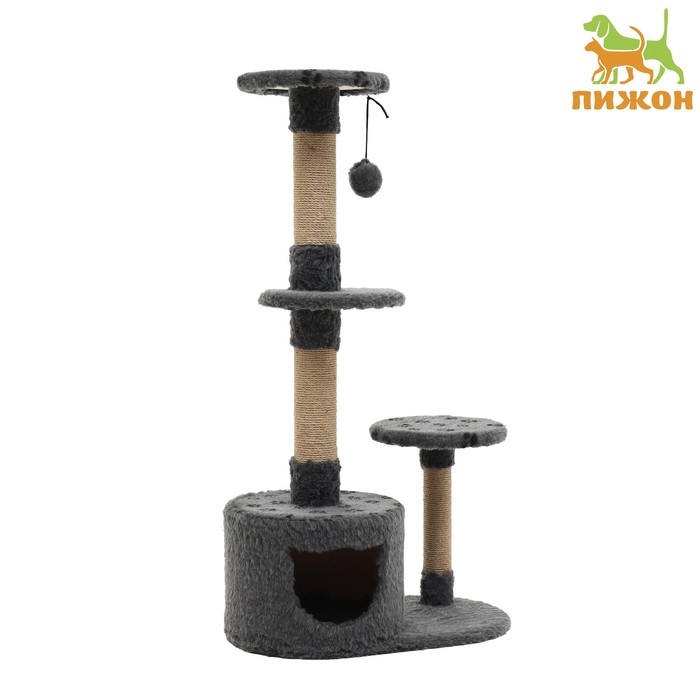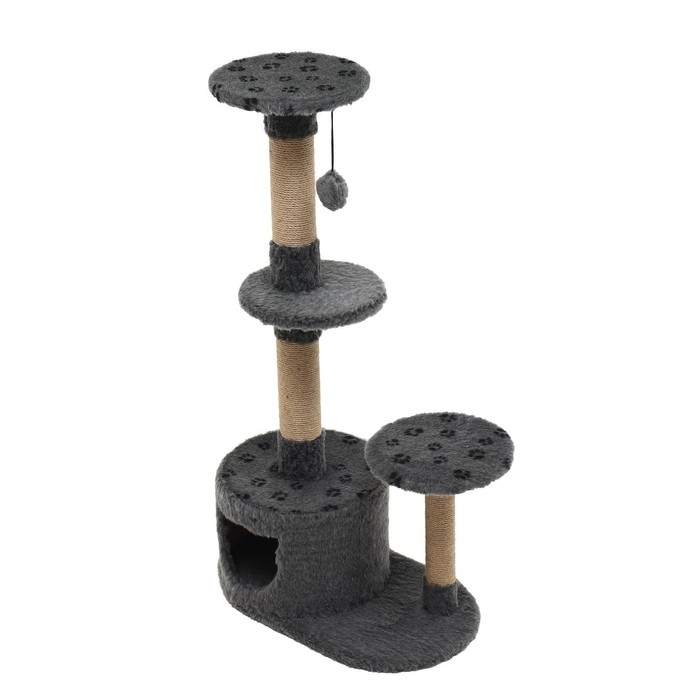 Комплекс изготовлен из прочных материалов, таких как джут и искусственный мех, что гарантирует его долговечность и устойчивость к кошачьим когтям. Высота в 107 см и наличие трёх уровней предоставляют кошке пространство для прыжков, лазанья и наблюдений за происходящим вокруг. На первом уровне размещен уютный домик, где питомец сможет уединиться, а верхние уровни идеально подходят для игр и охоты.