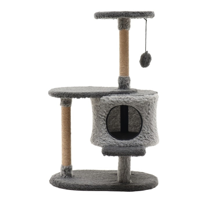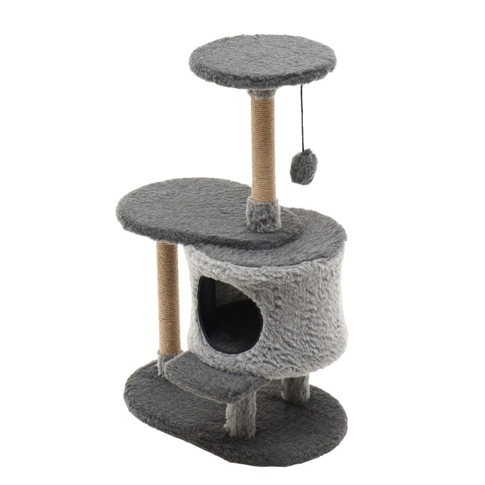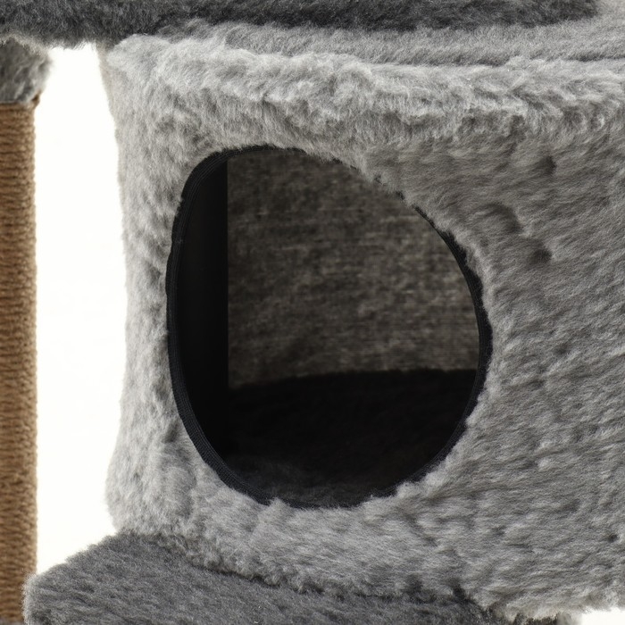 Комплекс выполнен в элегантном сером цвете и включает в себя просторный закрытый домик, который станет любимым местом для сна и спокойного отдыха вашего пушистого друга. На удобных площадках кошка сможет оттачивать свои прыжки и навыки охоты, а столбики, обтянутые джутом, служат отличными когтеточками, удовлетворяя естественную потребность в стачивании когтей.