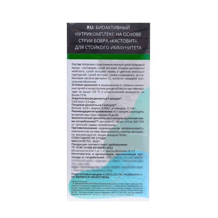Состав и форма выпуска: бобровая струя (измельченный сухой бобровый мускус - кастореум); сухой экстракт плодов шиповника майского; сухой экстракт травы и цветков эхинацеи пурпурной; сухой экстракт гриба кордицепса; аскорбиновая кислота (витамин С) желатин пищевой (капсульная оболочка).