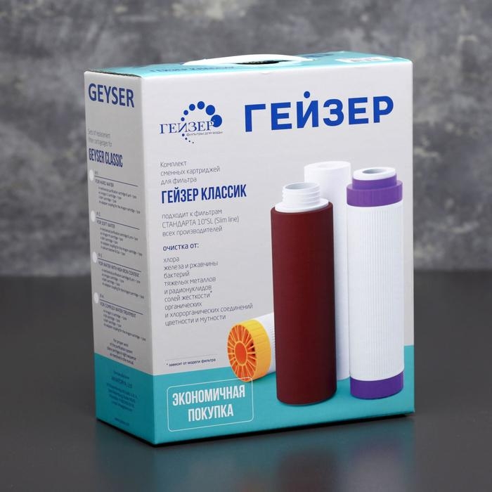 Набор содержит в себе всё необходимое для поддержания высокого уровня комплексной очистки воды в фильтрах «Гейзер Классик».