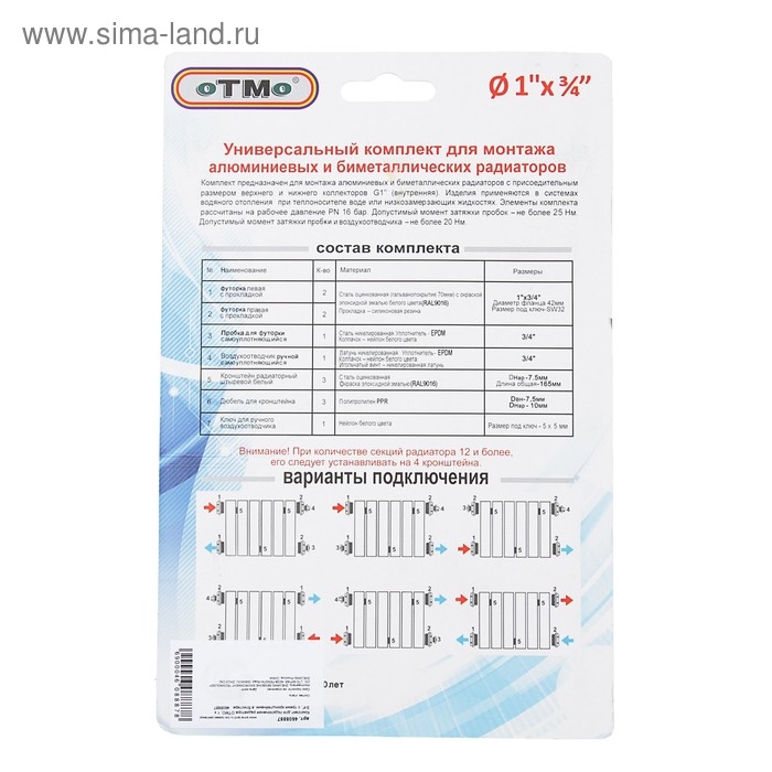 Комплект для подключения радиатора OTMO, 1 х 3/4", с тремя кронштейнами, в блистере