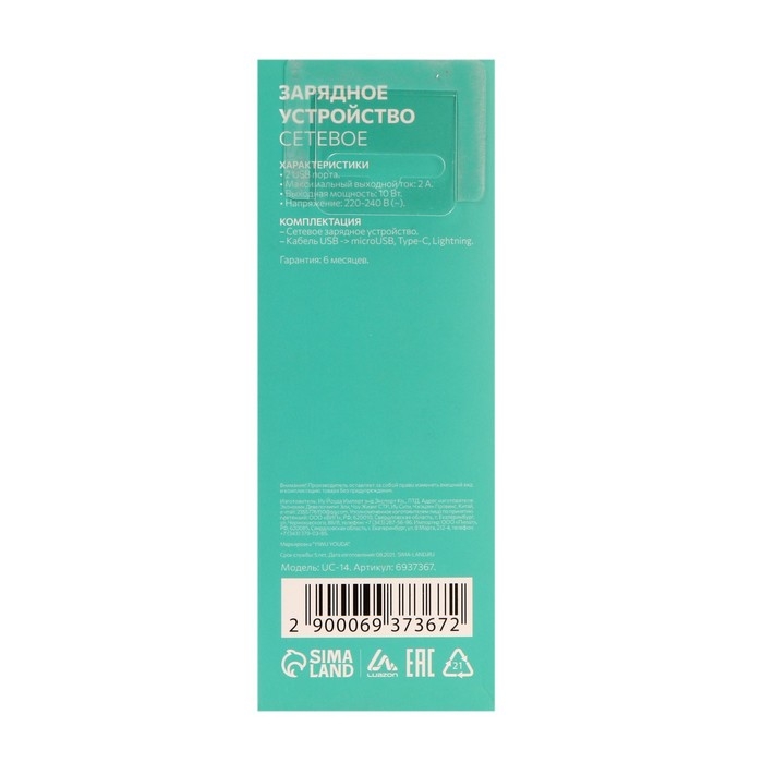 Комплект для зарядки 3 в 1 Luazon UC-14, СЗУ 2хUSB, 2A, microUSB/Type-C/Lightning, белый