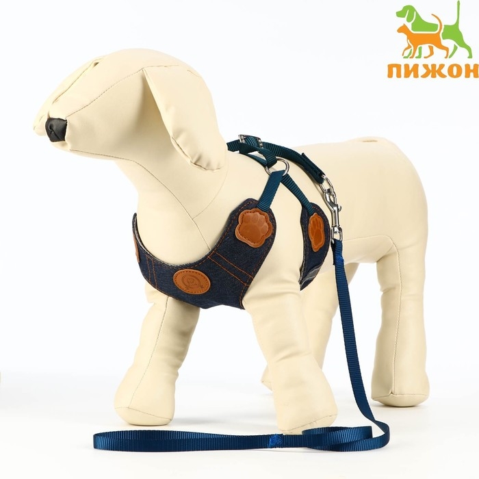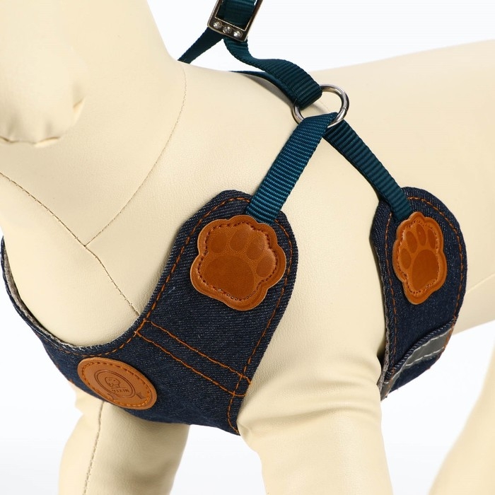 Стильный джинсовый прогулочный комплект для собак со светоотражающими элементами. Шлейка регулируется и за счет жилета не давит на грудь и шею, равномерно распределяет нагрузку. Шлея для собак 3 , 5 , 10 , 15 кг средних и мелких пород : шпица , бульдога , чихуахуа , йорка , мопс , такс и маленьких и больших кошек , котов типа мейн кун . Шлейка текстильная , регулируется металическим креплением со стразами. Поводок крепится к металлическому кольцу карабином. Шлейка исключит побег животного, если правильно подобрать размер и отрегулировать ремни.