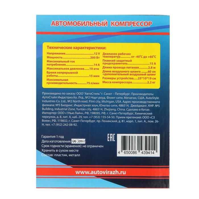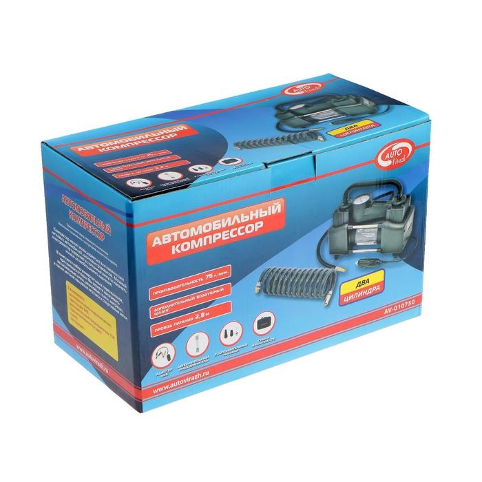 Компрессор автомобильный, двухцилиндровый Autovirazh 75 л/мин с манометром AV-010750