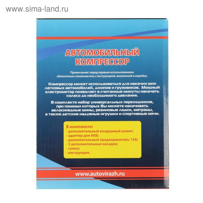 Компрессор AUTOVIRAZH двухцилиндровый 75 л/мин с манометром шт AV-010750 - незаменимый помощник автолюбителей. Предназначен для подкачки шин. В комплект входят специальные насадки, которые позволяют быстро наполнять воздухом плавательные круги, матрасы, лодки, а также другие надувные изделия.