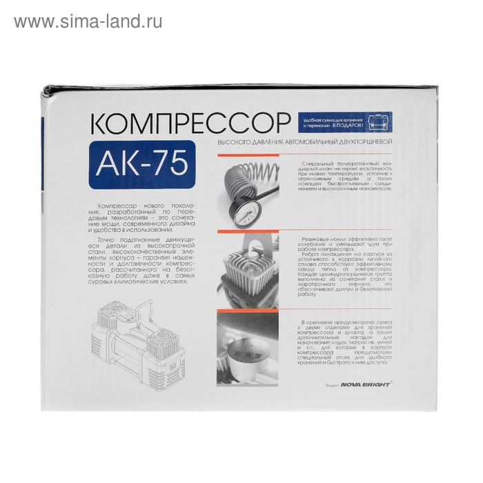 Компрессор автомобильный Nova Bright АК-75 двухпоршневой, металлический корпус, в сумке, 12В