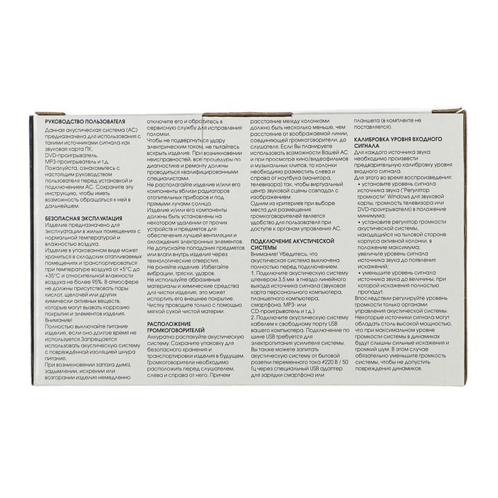 Акустическая система Dialog компактна и проста в использовании, легко брать с собой. Не требует сетевого источника питания: достаточно просто подключить прибор к USB-порту и аудиоразъёму компьютера и наслаждаться звуком. Громкость регулируется одним движением. Высокие технические показатели воспроизведения гарантируют качественный звук: пиковая мощность – 2 Вт для каждой колонки, диапазон частот – от 200 до 20 000 Гц.