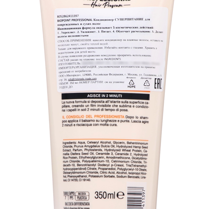 Кондиционер BIOPOINT PROFESSIONAL для поврежденных и сухих волос, 350 мл