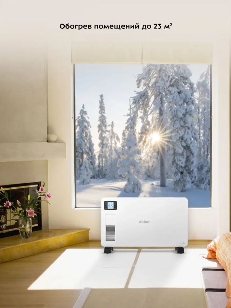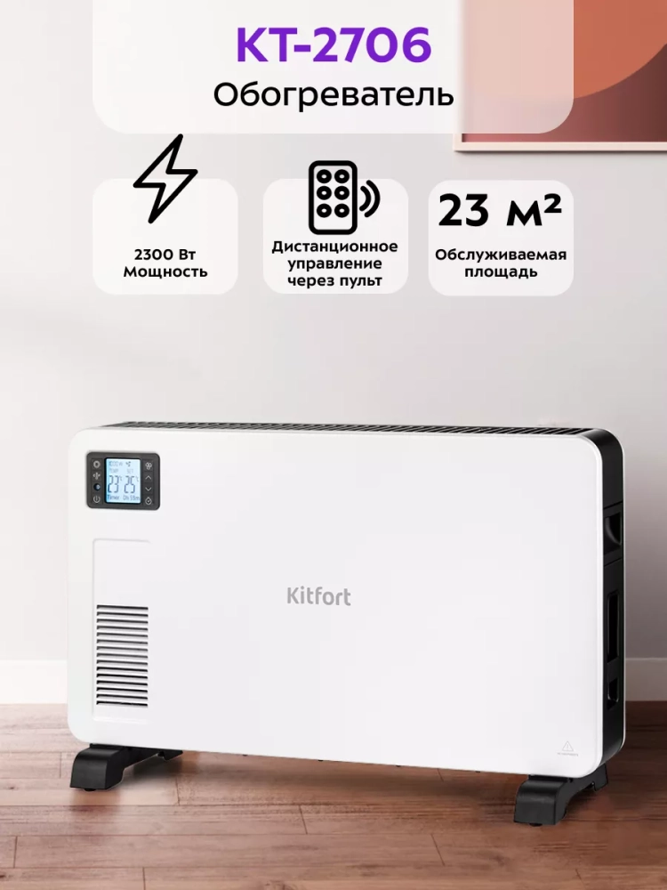 Обогреватель Kitfort KT-2706 предназначен для обогрева воздуха в квартирах, загородных домах, офисах. Прибор имеет три уровня мощности и электронный термостат для регулировки температуры в помещении. В корпус прибора установлен вентилятор, который усиливает циркуляцию нагретого воздуха и ускоряет нагрев помещения. На корпусе обогревателя KT-2706 расположена сенсорная панель управления и LCD-дисплей. Вы также можете управлять работой устройства с помощью пульта дистанционного управления (ДУ). Питание пульта ДУ происходит от 1 батарейки CR2032 (входит в комплект). KT-2706 относится к конвекторному типу обогревателей. Устройство предназначено для напольного размещения. На корпусе обогревателя расположены ручки для удобного перемещения прибора и отсек для пульта ДУ. Обогреватель оснащен защитой от перегрева и режимом «Защита от замерзания». Работа прибора в режиме «Защита от замерзания» позволяет поддерживать стабильную температуру в помещении около 5 *С, чтобы помещение не промерзало в ваше отсутствие. Прибор подходит для обогрева помещений до 23 кв. м. При небольшой разнице температур снаружи и внутри, высокой теплоизоляции помещения и низкой вентиляции, обслуживаемая площадь будет больше.